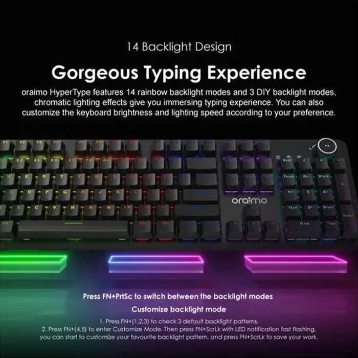 oraimo HyperType propose 14 modes de rétroéclairage arc-en-ciel et 3 modes de rétroéclairage DIY, les effets d’éclairage chromatiques vous offrent une expérience de frappe immersive. Vous pouvez également personnaliser la luminosité et la vitesse d’éclairage du clavier selon vos préférences.