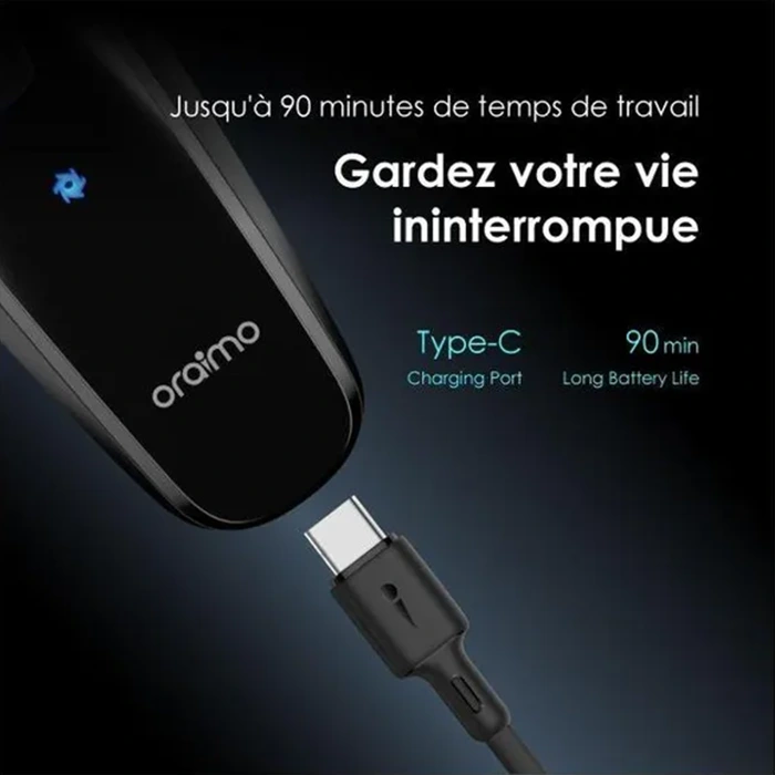 Chargez-le une fois et détendez-vous. Oraimo SmartShaver avec une longue durée de vie de la batterie vous permet d’utiliser l’appareil pour plusieurs rasages sans avoir à courir pour le recharger tous les deux jours.