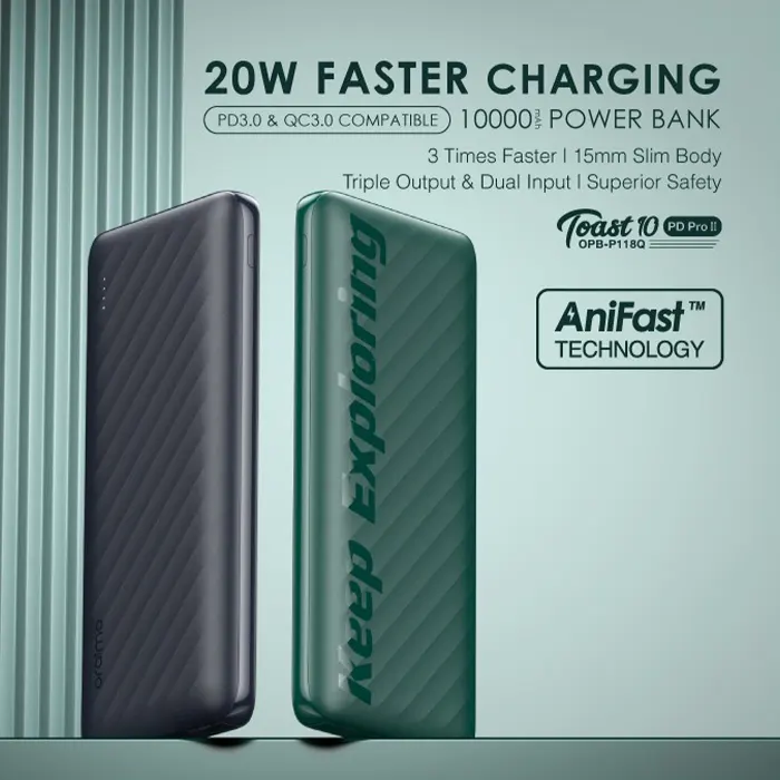 Équipée de la puce exclusive d’oraimo, la banque d’alimentation AniFast TM peut identifier intelligemment le protocole de charge rapide de l’appareil pour fournir la charge la plus rapide possible et charger vos appareils à une vitesse maximale de 20 W.