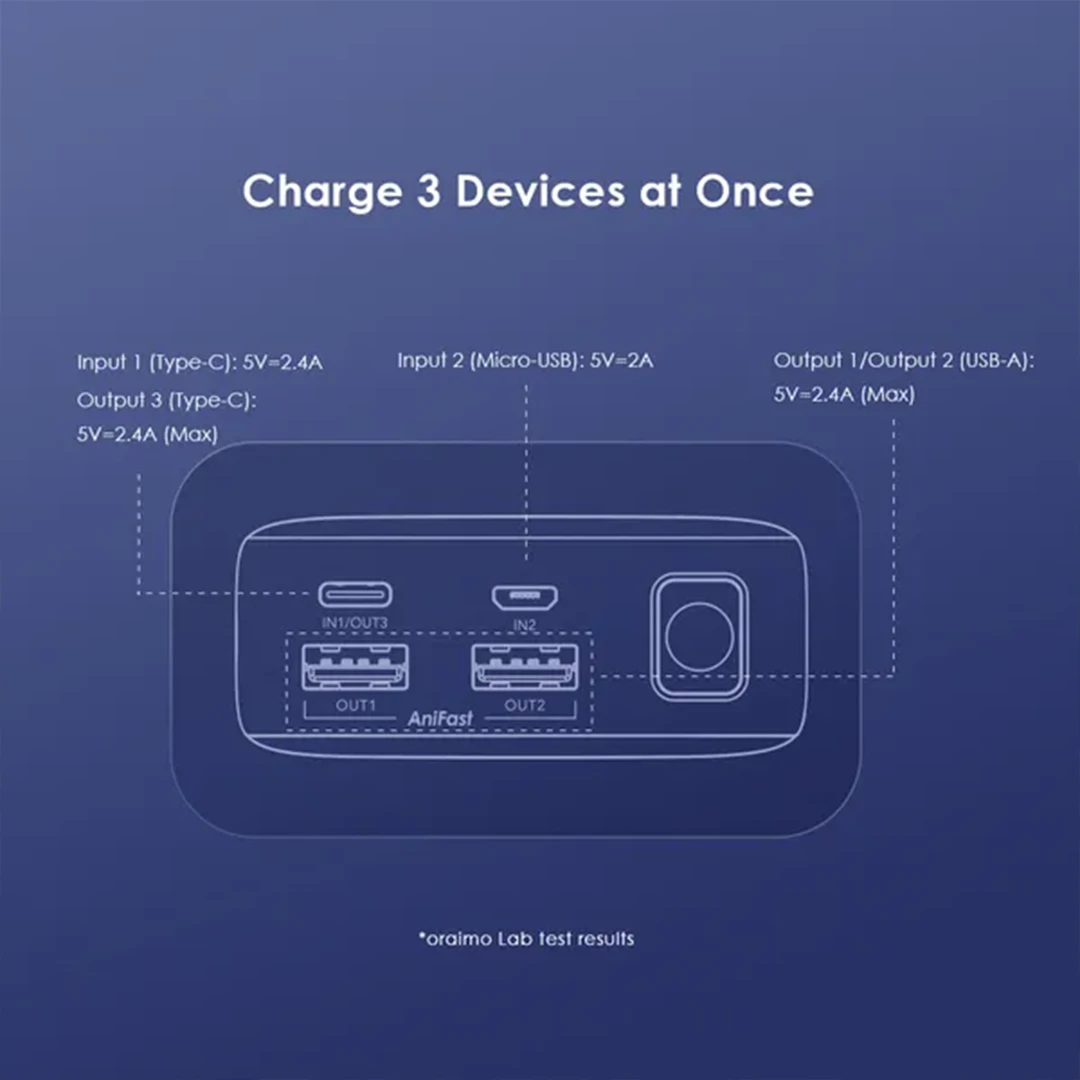 Compatible with Samsung and Apple and more devices, the oraimo Traveler 12 fuels your multitasking lifestyle with triple outputs.