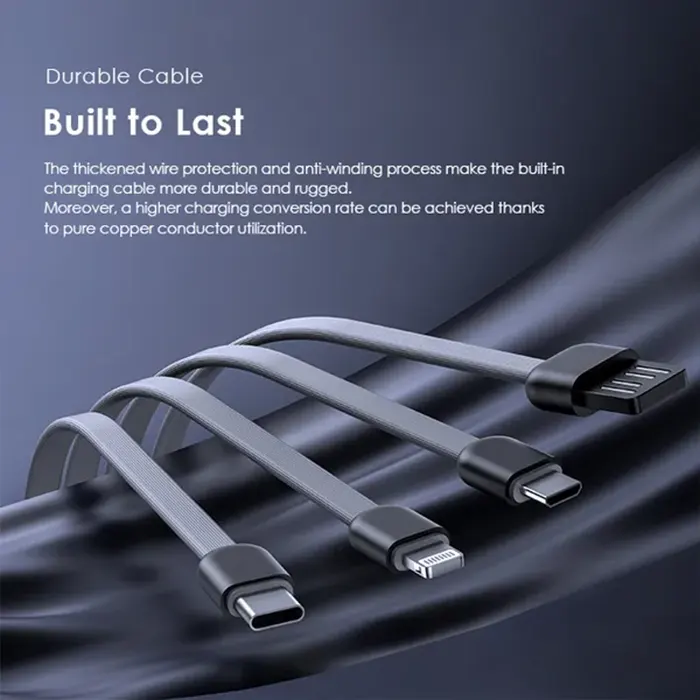 La protection du fil épaissi et le processus anti-enroulement rendent le câble de charge intégré plus durable et robuste. De plus, l’utilisation de conducteurs en cuivre pur permet d’obtenir un taux de conversion de charge plus élevé