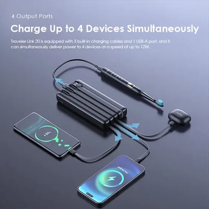 Traveler Link 20 est équipé de 3 câbles de charge intégrés et d’un port USB-A. Traveler Link 20 peut