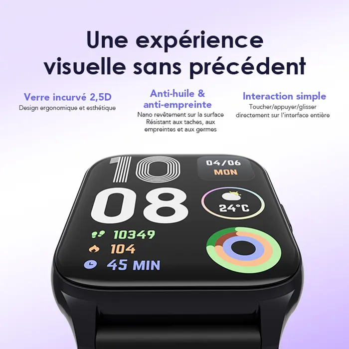 Vous pouvez recharger la montre pendant votre routine matinale lorsque vous prenez une douche ou que vous vous brossez les dents. La batterie au lithium polymère peut tenir jusqu’à 24 heures avec une charge rapide de 25 minutes et jusqu’à 7 jours avec une charge complète de 3 heures.