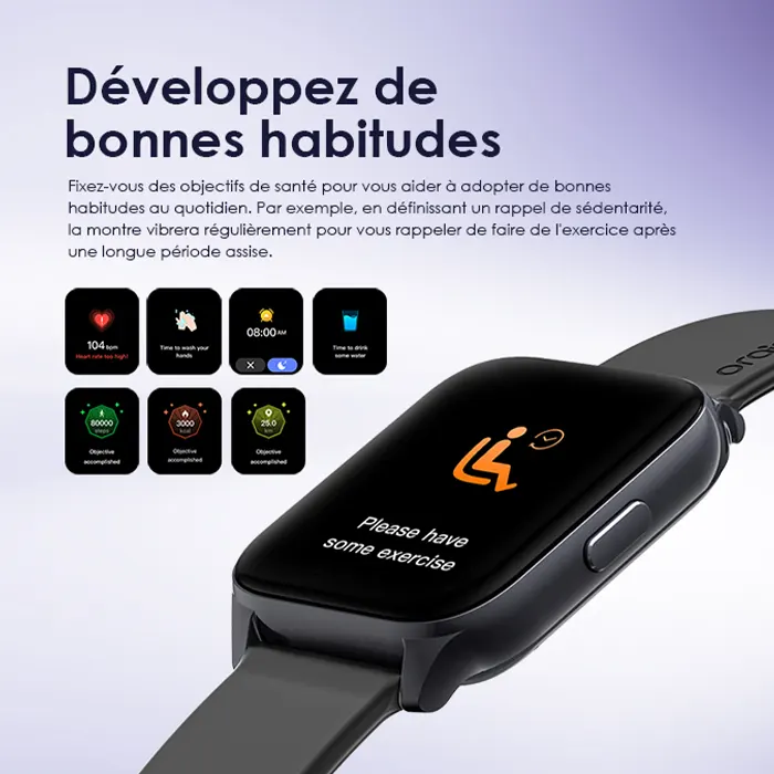 Fixez-vous des objectifs de santé pour vous aider à adopter de bonnes habitudes au quotidien. Par exemple, en définissant un rappel de sédentarité, la montre vibrera régulièrement pour vous rappeler de faire de l’exercice après une longue période assise.